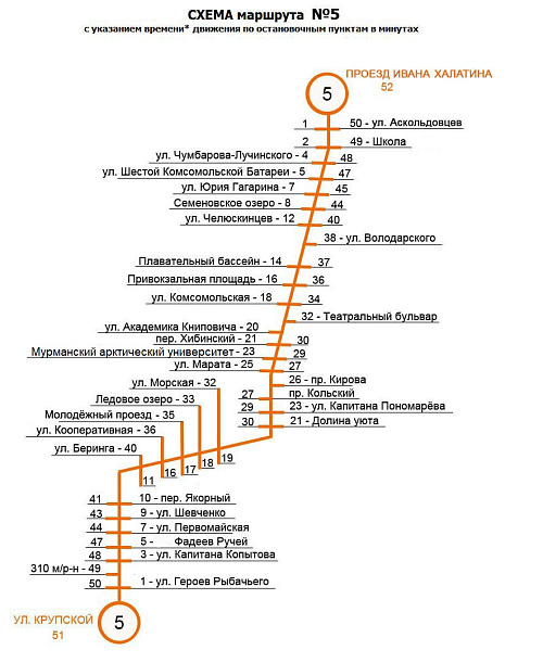 В схеме указано среднее время прохождения по маршруту (так как в зависимости от периода суток меняется от 5 до 6 раз).